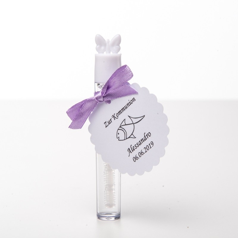 Personalisierte Anhänger für Gastgeschenke oder Seifenblasen. Individuell bedruckt mit Namen und Datum.
