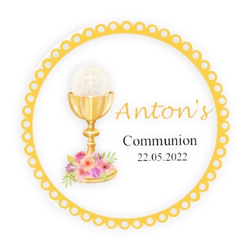 Mit den 24 runden und personalisierten Aufkleber “Kelch” verleihst den Gastgeschenken zur Kommunion ein wunderschönes Aussehen und überraschst Deine Gäste!