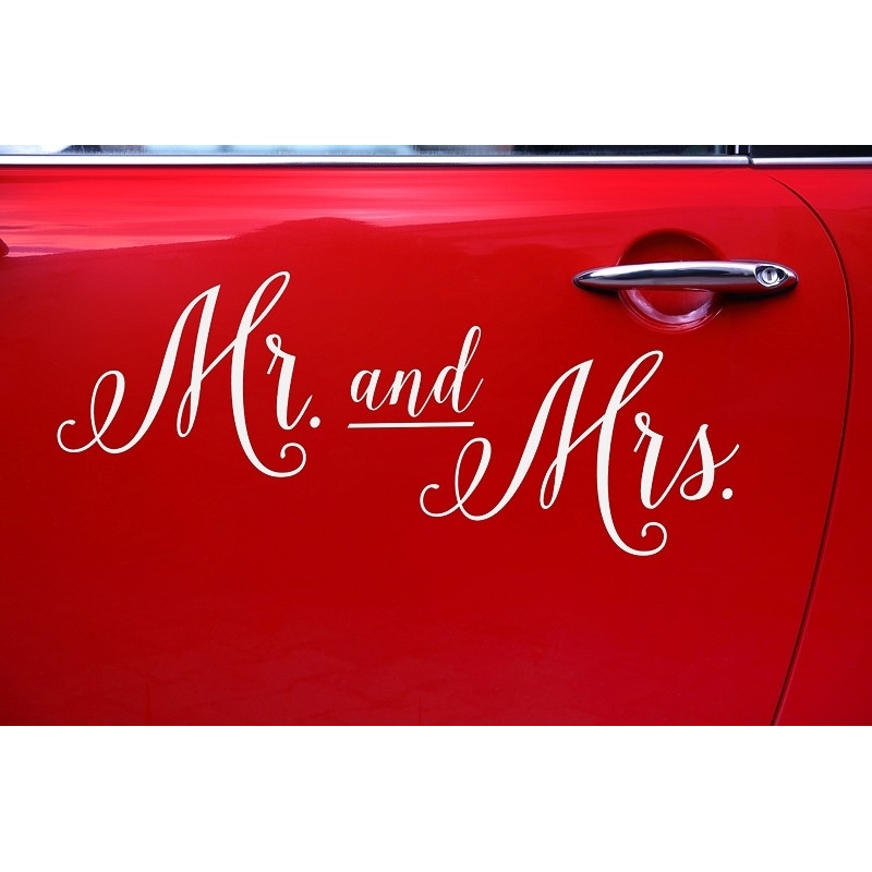 Dank diesem Aufkleber mit der Aufschrift 'Mr and Mrs' wird die Autodekoration vom Brautpaar perfekt sein. Sie können den Aufkleber an die Heckscheibe, an die Tür oder an die Motorhaube des Autos kleben. Einfaches Anbringen am Auto.