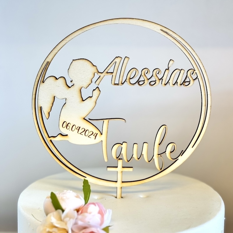Dieser wunderschöne Tortenaufsatz/Caketopper mit Wunschname und Datum aus Holz ist die ideale Möglichkeit eine Torte zu verschönern und ihr das gewisse etwas zu verleihen. Ein echter Hingucker auf jeder Taufe.