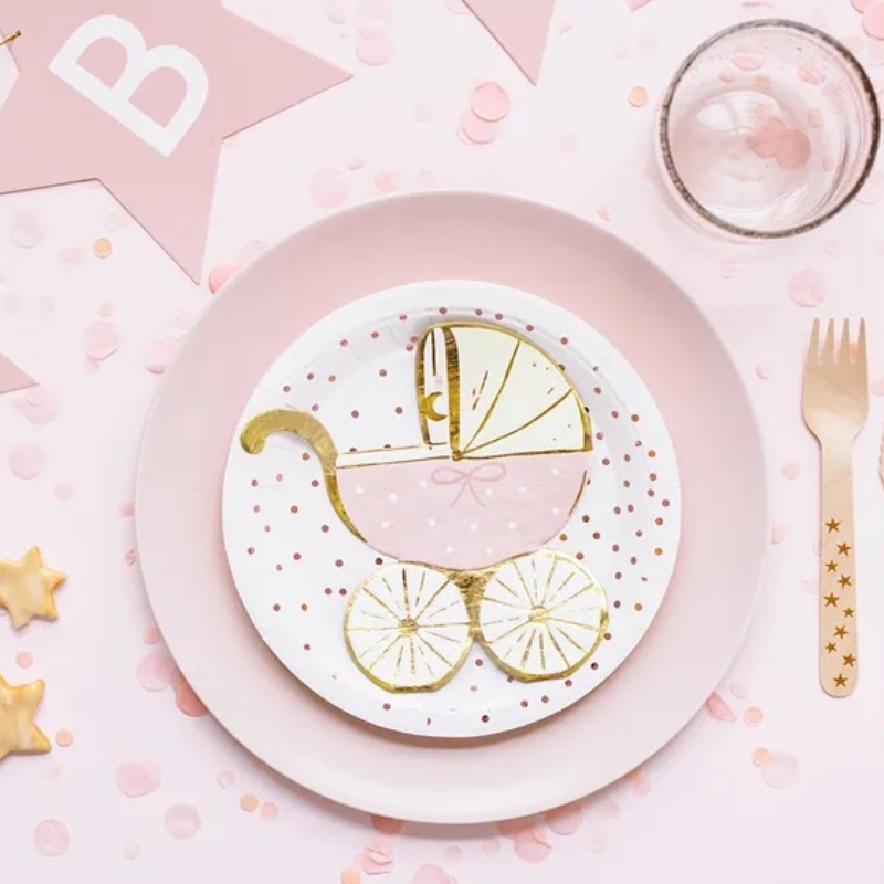 Diese stilvollen Servietten mit Kinderwagen-Motiv in Rosa und Gold sind die perfekte Ergänzung für jede Babyparty, Taufe oder Geburtstagsfeier. Das elegante Design mit zarten Farben und glänzenden Details sorgt für eine festliche und liebevolle Atmosphäre auf Ihrem gedeckten Tisch.