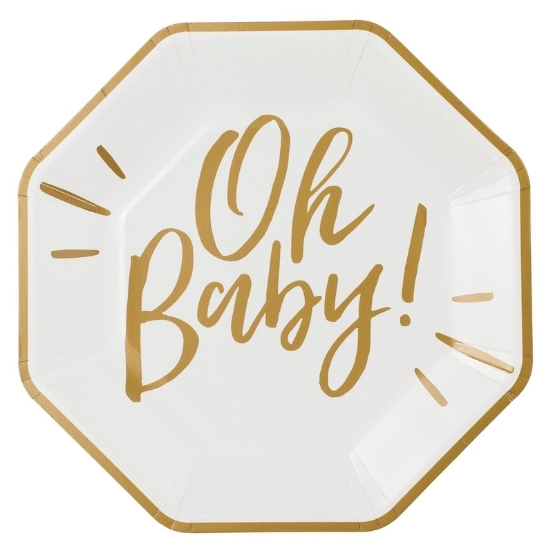 Stylische glänzende Pappteller in weiss mit der Aufschrift 'Oh Baby' in gold.