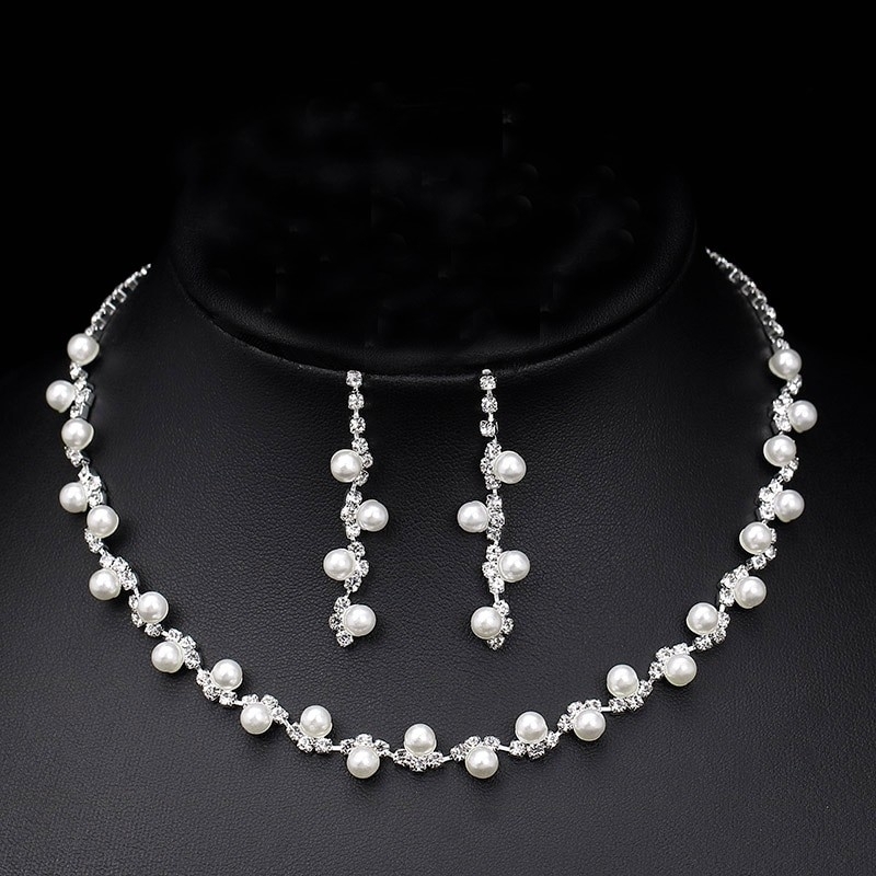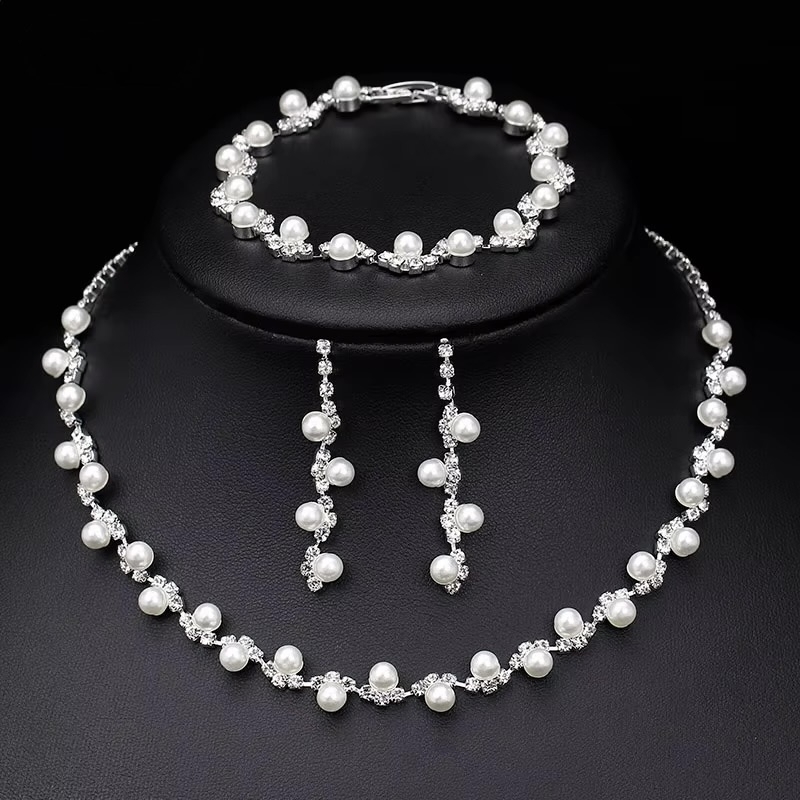 Dieses 3 teilige Schmuckset mit Strahlenden Strass Steinchen und Weissen Perlen eignet sich ideal als Ergänzung für ihre Hochzeit.