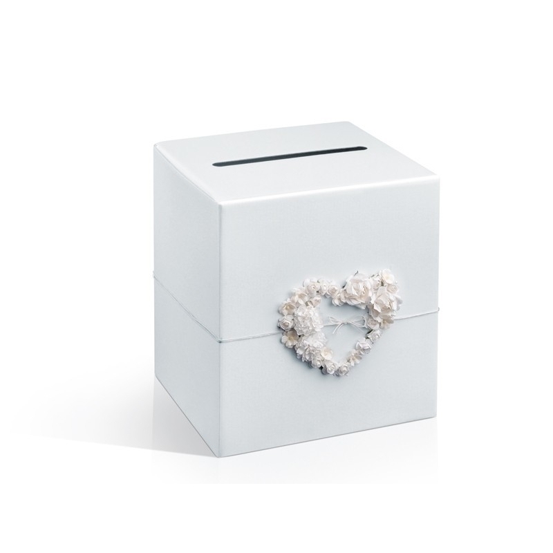 Weisse süsse Hochzeitssammelbox mit Schlitz aus Perlweiss schimmerndem festen Karton mit Herzmotiv aus cremefarbenen Röschen und feinem Bändchen appliziert.