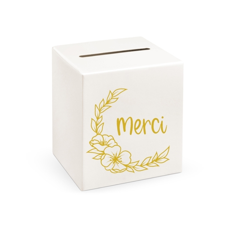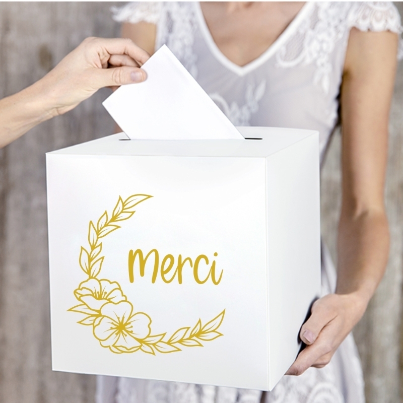 Die Kombination aus klarer Form, weisser Oberfläche und goldenem floralen Motiv mit der Aufschrift "Merci" macht die Box zu einem echten Blickfang. Das robuste Material sorgt dafür, dass Karten und Umschläge sicher gesammelt werden, ohne zu knicken oder herauszufallen.