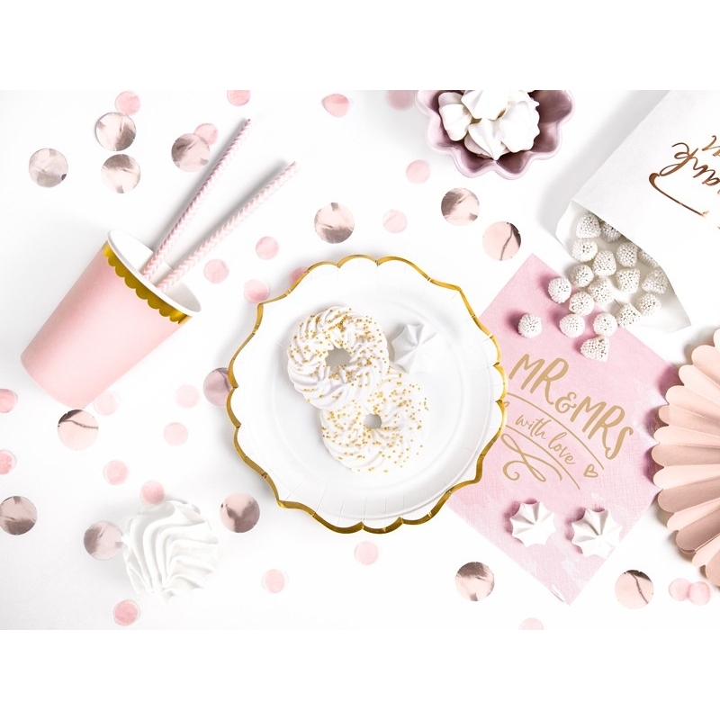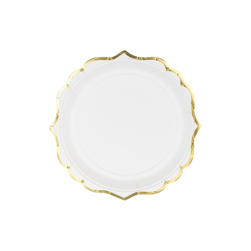 6 weisse, aussergewöhnlich geformte Pappteller mit einem glänzendem Goldrand. Die Pappteller sind perfekt für verschiedene Anlässe wie Hochzeiten, Geburtstage, Kommunion oder auch Taufen. Ob zum Servieren von Leckereien oder als Geschirr für die Partygäste, die Teller sind vielseitig einsetzbar.