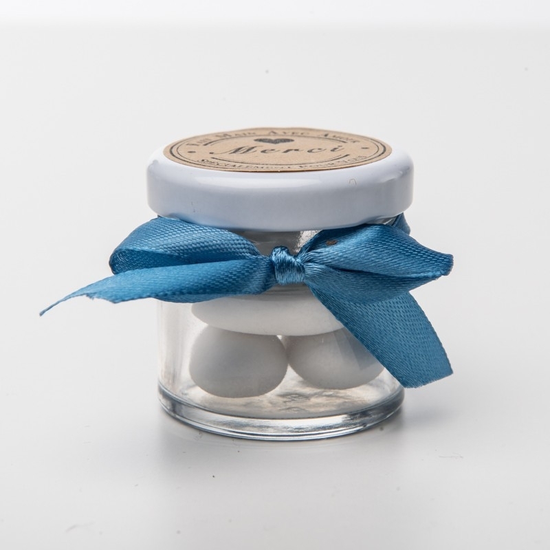 Perfekt als elegantes Gastgeschenk zur Hochzeit: Schraubgläschen mit Deckel und Satinschleife. Auf dem Deckel ist ein Aufkleber mit dem Schriftzug "Merci" in Beige angebracht. Das fertige Gastgeschenk wird mit fünf Hochzeitsmandeln geliefert.