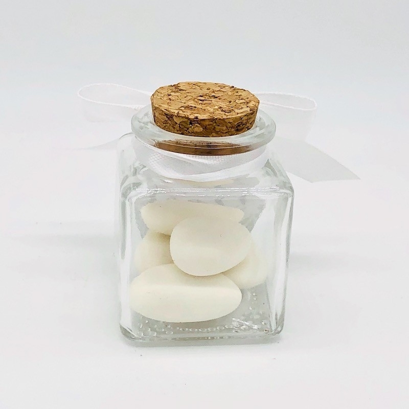 Inhalt: Miniglas, Schleife, Sticker & 5 Mandeln. Die Hochzeitsmandeln werden separat geliefert, damit diese während dem Transport in den Gläschen nicht beschädigt werden. Einfach je 5 Hochzeitsmandeln in die Korkengläser füllen und Fertig.