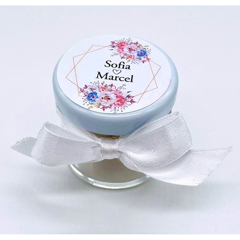 Die Glasfläschchen werden mit 5 Mandeln, Schleife und personalisierter Aufkleber geliefert.