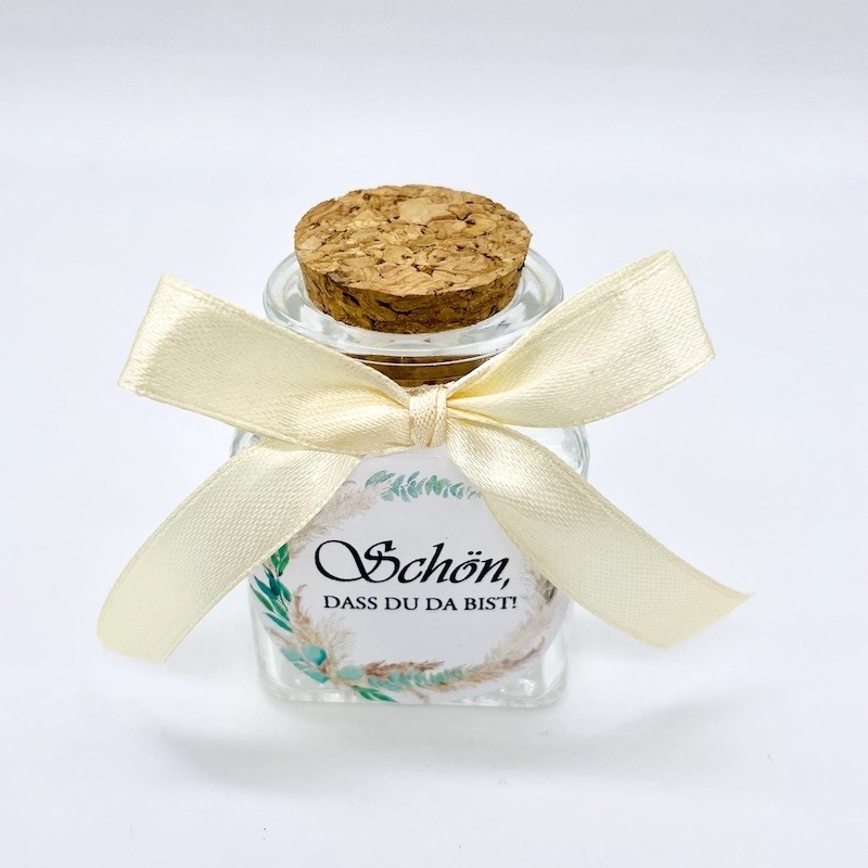 Perfekt als elegantes Gastgeschenk zur Hochzeit: Korkenglas und Satinschleife. Auf der Vorderseite ist ein Aufkleber mit dem Schriftzug "Schön dass du da bist" angebracht.