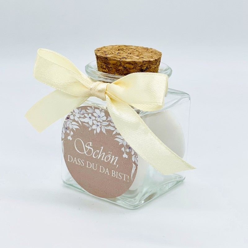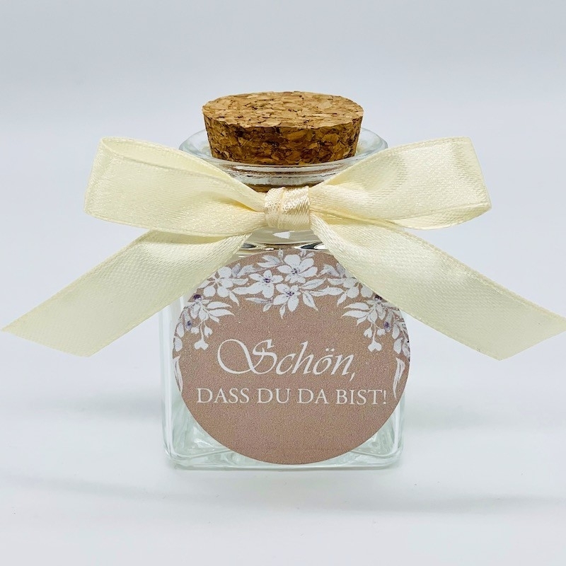 Perfekt als elegantes Gastgeschenk zur Hochzeit: Korkenglas und Satinschleife. Auf der Vorderseite ist ein Aufkleber mit dem Schriftzug "Schön dass du da bist" angebracht.