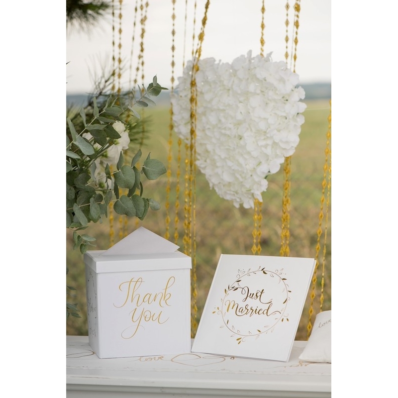 Das Gästebuch JUST MARRIED in weiss-gold läd die Hochzeitsgäste ein, Glückwünsche, Sprüche und Zitate in das Gästebuch für das Brautpaar einzutragen. Auf dem Gästebuch ist der Schriftzug JUST MARRIED in einem Blätterkreis aufgedruckt.