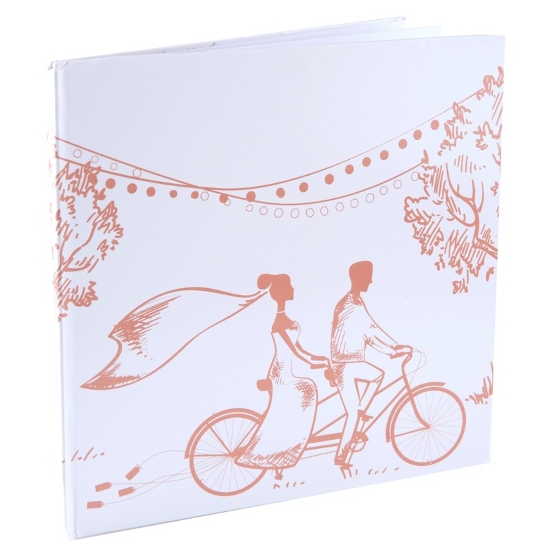 Dieses Gästebuch umfasst 20 doppelseitige Seiten und zeichnet sich durch ein zeitloses Design mit einem einem Brautpaar auf einem Tandemfahrrad aus.