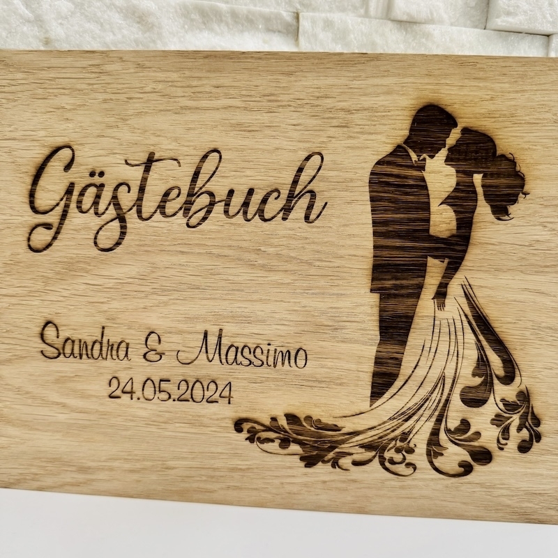 Wir gravieren Euch das Design, ersetzen es mit den gewünschten Namen und Datum für Euer individuelles Hochzeitsgästebuch. Unser Laser brennt hochpräzise Ihre Inhalte in die Oberfläche des Holzes ein. Daher kommt der dunkle Farbton mit einem tollen Kontrast zustande.