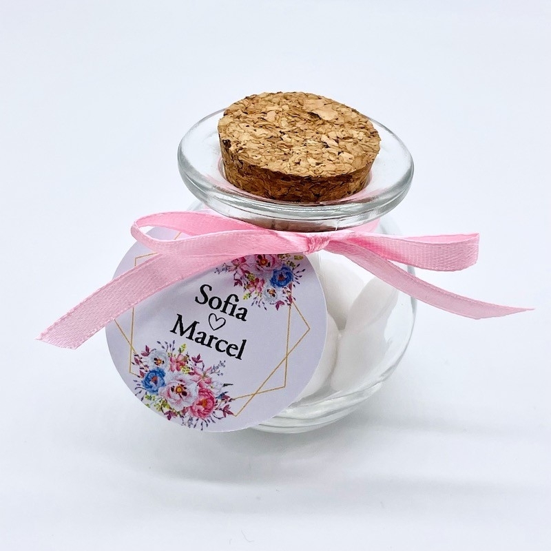 Dieses Gastgeschenk Set beinhaltet alles was Ihr für 45 Gastgeschenke benötigt. Füllt je 5 Hochzeitsmandeln in die Gläser, Anhänger und Satinband um das Glas binden...FERTIG!