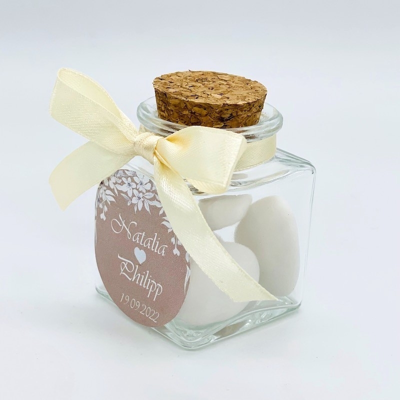 Dieses Gastgeschenk Set beinhaltet alles was Ihr für 45 Gastgeschenke benötigt. Füllt je 5 Hochzeitsmandeln in die Gläser, Anhänger und Satinband um das Glas binden...FERTIG!