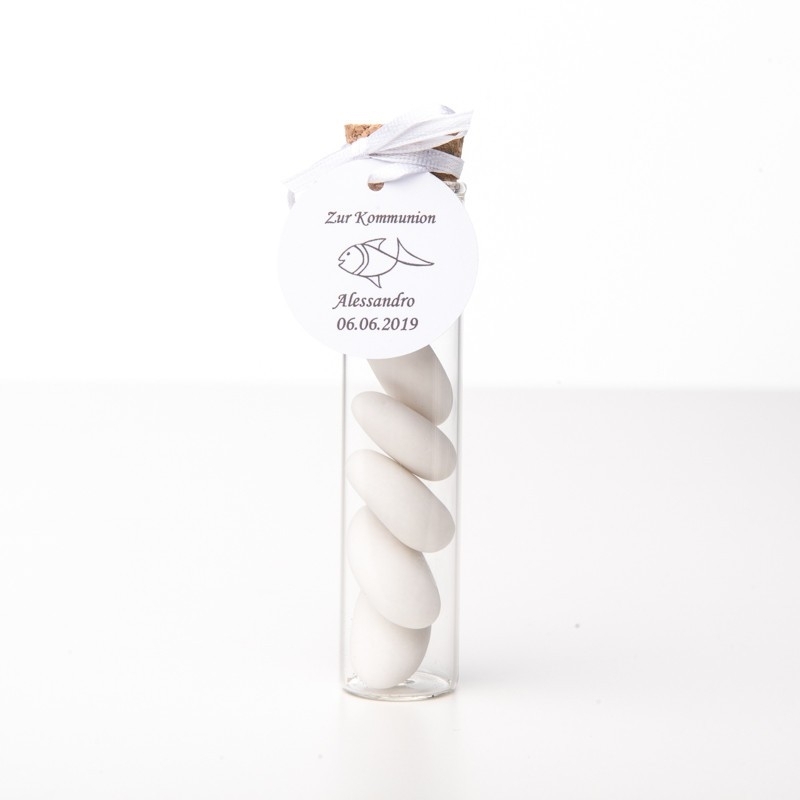 - Inhalt: Glasfläschchen gefüllt mit 5 weisse Mandeln, Schleife und personalisierter Anhänger.