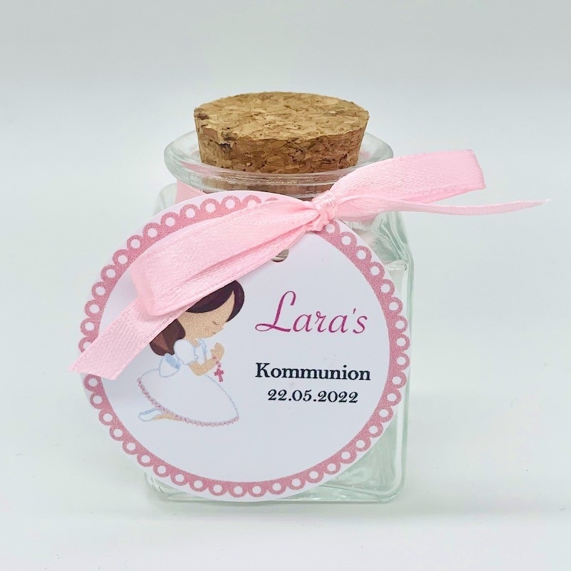 Perfekt als elegantes Gastgeschenk zur Kommunion: Korkenglas und Satinschleife.