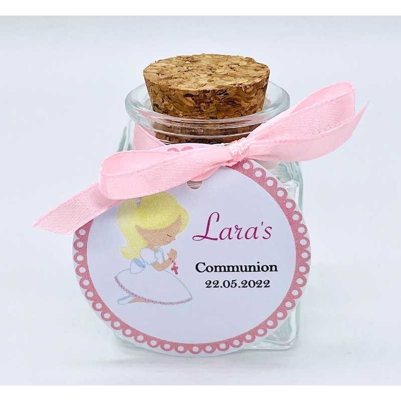 Perfekt als elegantes Gastgeschenk zur Kommunion: Korkenglas und Satinschleife.