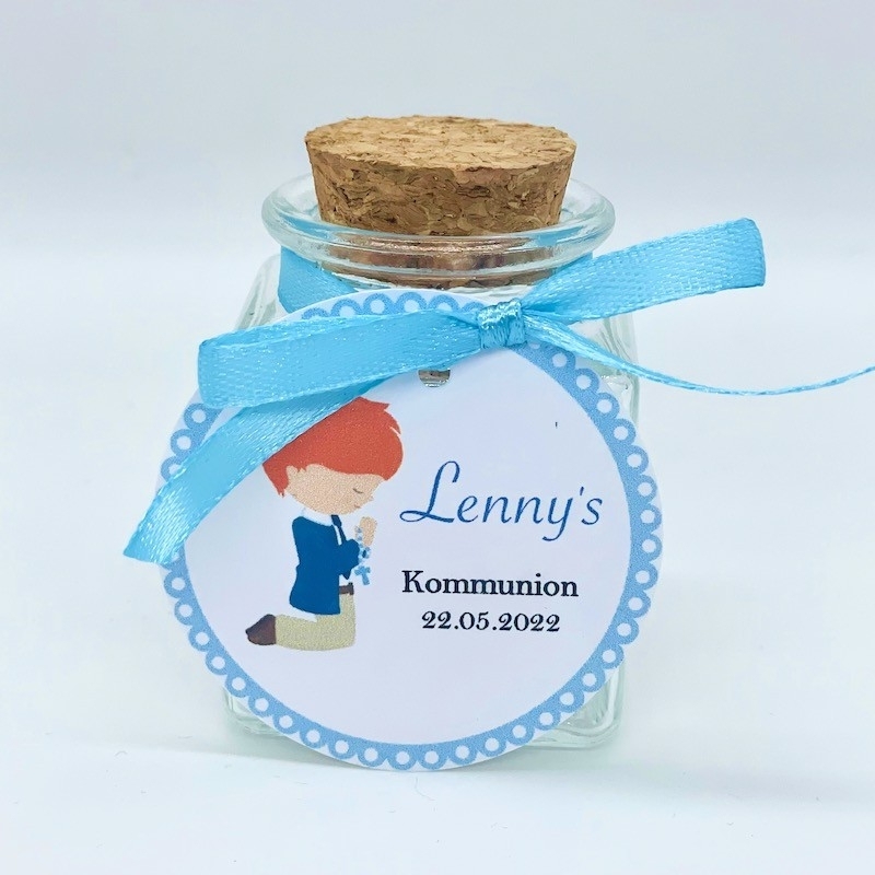 Perfekt als elegantes Gastgeschenk zur Kommunion: Korkenglas und Satinschleife.