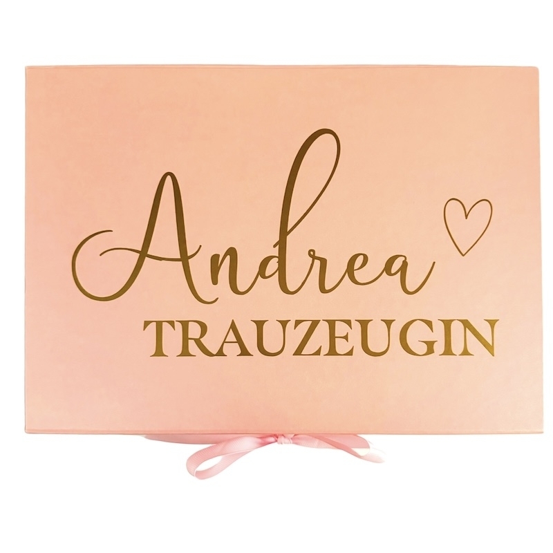 Die hochwertige Geschenk-Box zum selber befüllen ist eine tolle Geschenkidee für die Trauzeugin. Die personalisierte Box kann mit allem möglichen befüllt werden, zum Beispiel mit einem Morgenmantel, Strumpfband ein T-Shirt u.v.m. Ein "Wow" Effekt ist garantiert.