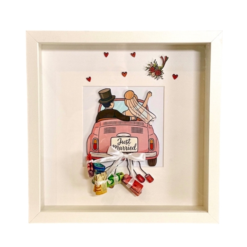 Einen langweiligen Umschlag mit ein paar Geldscheinen zu verschenken, ist nicht besonders kreativ. Mit dieser individuell und personalisierter Geldverpackung freut sich das Hochzeitspaar sicher nicht nur über das Geld. An den 6 weissen Bändchen werden die gerollten Geldscheine als "Dosen" festgebunden, die sich dann gut geschützt hinter der Scheibe befinden.