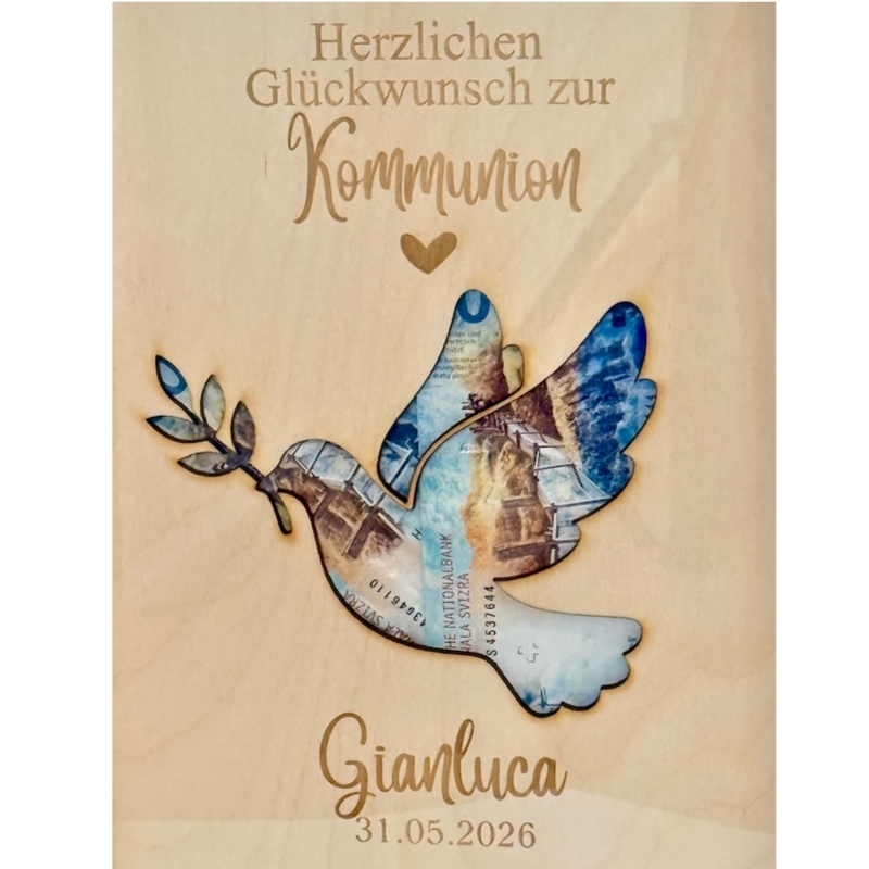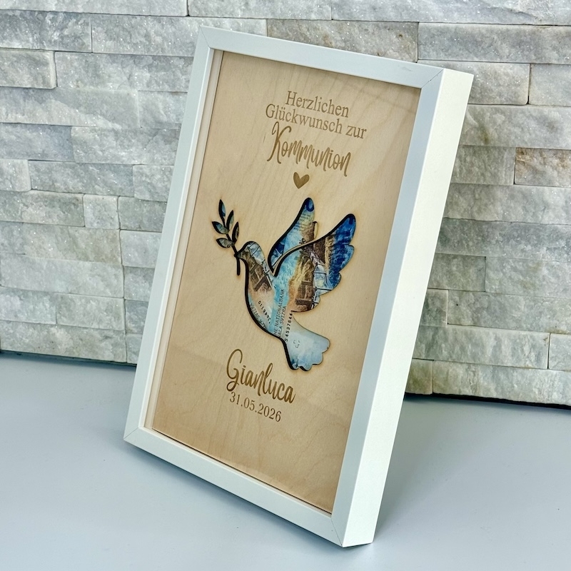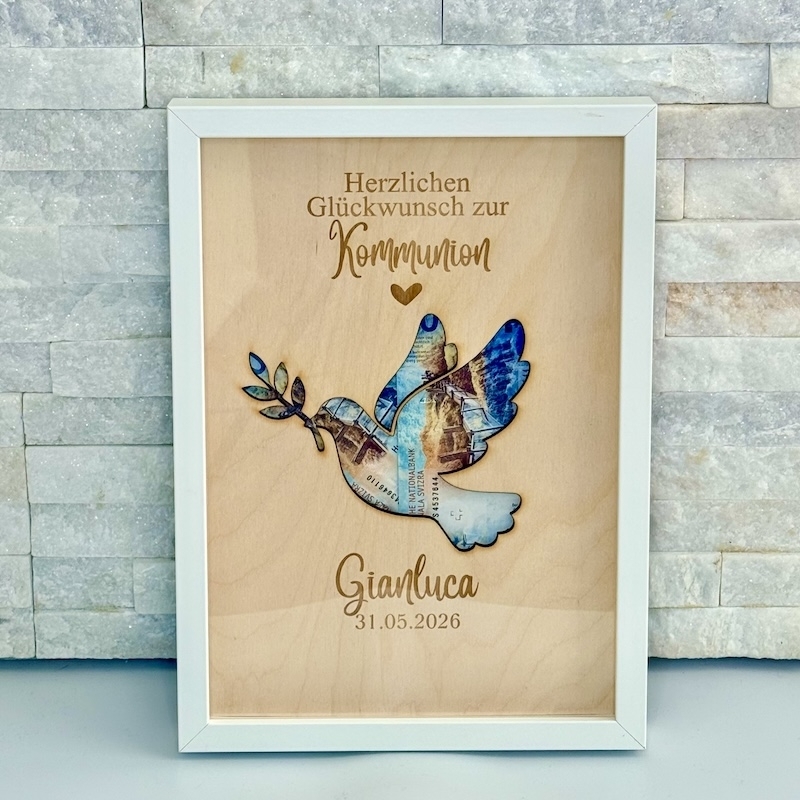 Du möchtest Geld zur Kommunion, Konfirmation oder zur Firmung schenken, aber nicht einfach in einem Umschlag? Dann ist dieser personalisierte Bilderrahmen die perfekte Lösung! Hinter der liebevoll gestalteten Taube lässt sich Geld stilvoll platzieren – so wird aus einem einfachen Geldgeschenk eine bleibende Erinnerung.