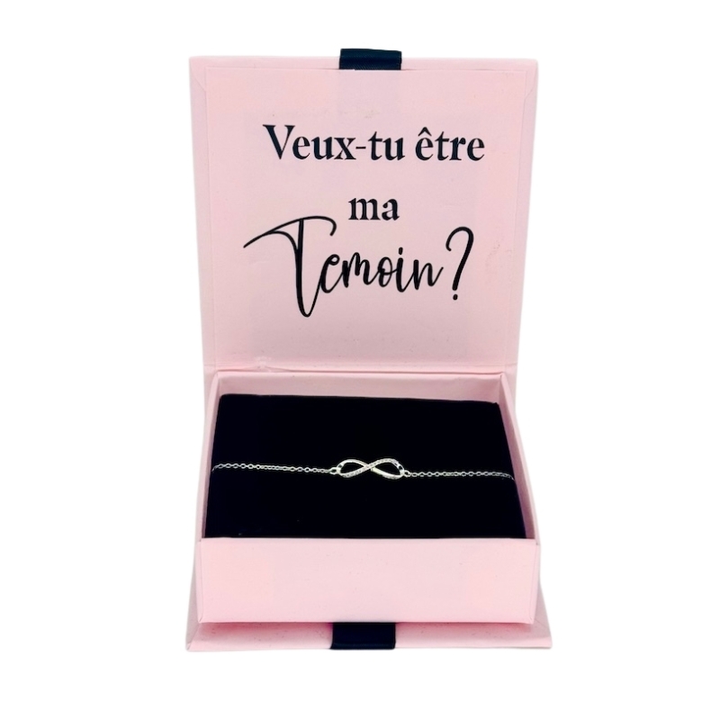 Dein Geschenk kommt hübsch verpackt in einer edlen Geschenkschachtel mit der Frage "Veux-tu être ma Témoin?" auf französisch.