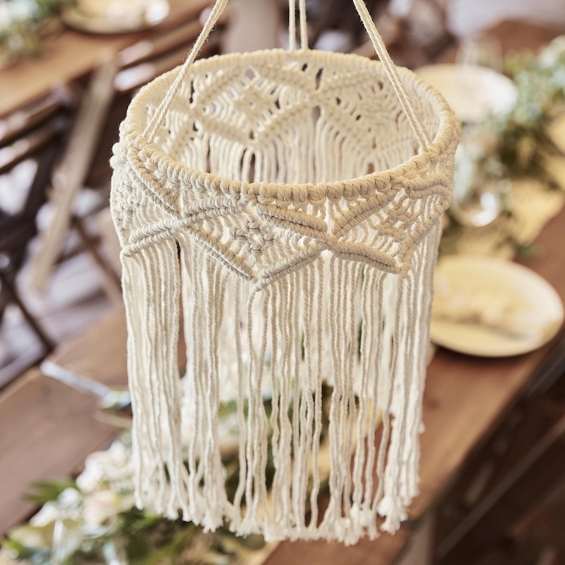 Verleihen Sie Ihrer Hochzeit mit diesem wunderschönen handgefertigten Makramee-Kronleuchter ein zeitgenössisches rustikales Flair. Verwenden Sie es, um eine schöne Dekoration auf Ihrer Hochzeit, Ihrem Junggesellinnenabschied oder jeder Feier als müheloses Statement-Stück zu schaffen.