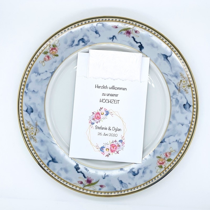 Handgefertigte Serviettentasche für Ihre Hochzeit inkl. Aufschrift Name und Datum. Die Serviette ist weiss mit Perlmutschimmer.