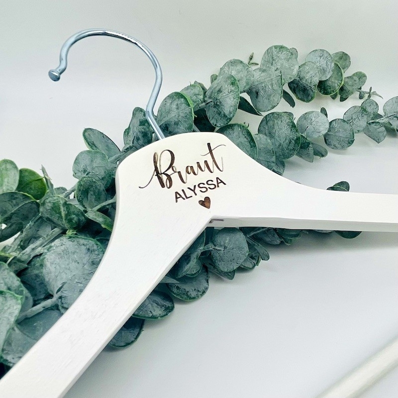 Hergestellt aus Massivholz und mit Präzision mit Lasertechnologie graviert, sind diese Kleiderbügel ein durchdachtes Geschenk für die zukünftige Braut.