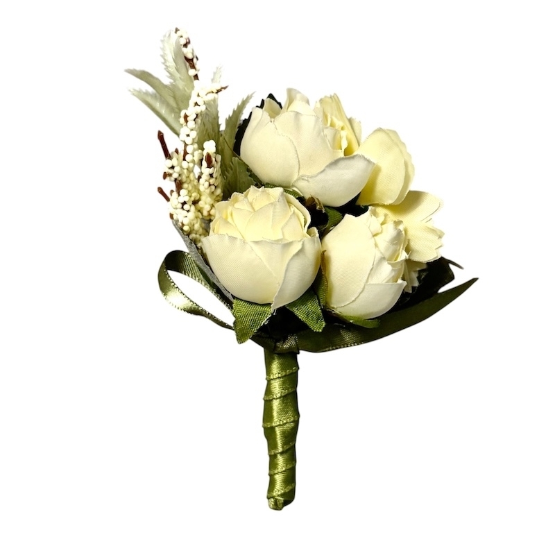 Sehr schöner Hochzeitsanstecker mit drei weisser Rosen, grüne Blätter und Eucalyptus, abgerundet wird diese kleine Schönheit mit einem Juteband. Die Anstecknadel ist Rückseitig angebracht.