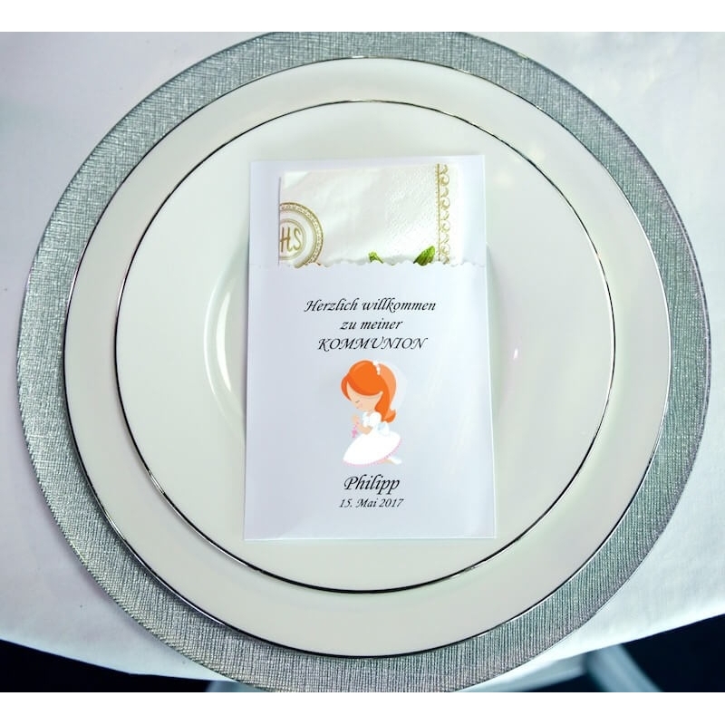 Handgefertigte Serviettentasche für Ihre Kommunion inkl. Aufschrift Name und Datum. Der Aufdruck der Serviette ist mit Kelch und Blumen.
