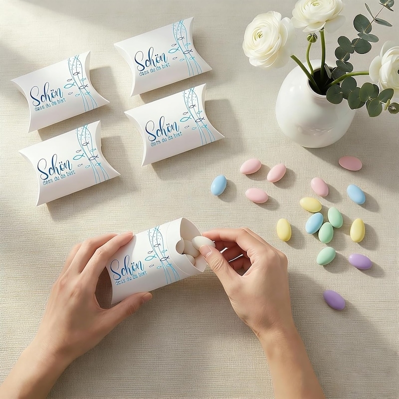 Die praktischen Schachteln eignen sich hervorragend zum Befüllen mit kleinen Geschenken, Süssigkeiten oder persönlichen Aufmerksamkeiten für deine Gäste. Dank ihrer handlichen Grösse von 9 x 6 x 2,5 cm sind sie vielseitig einsetzbar und lassen sich einfach auf dem Tisch dekorieren.
