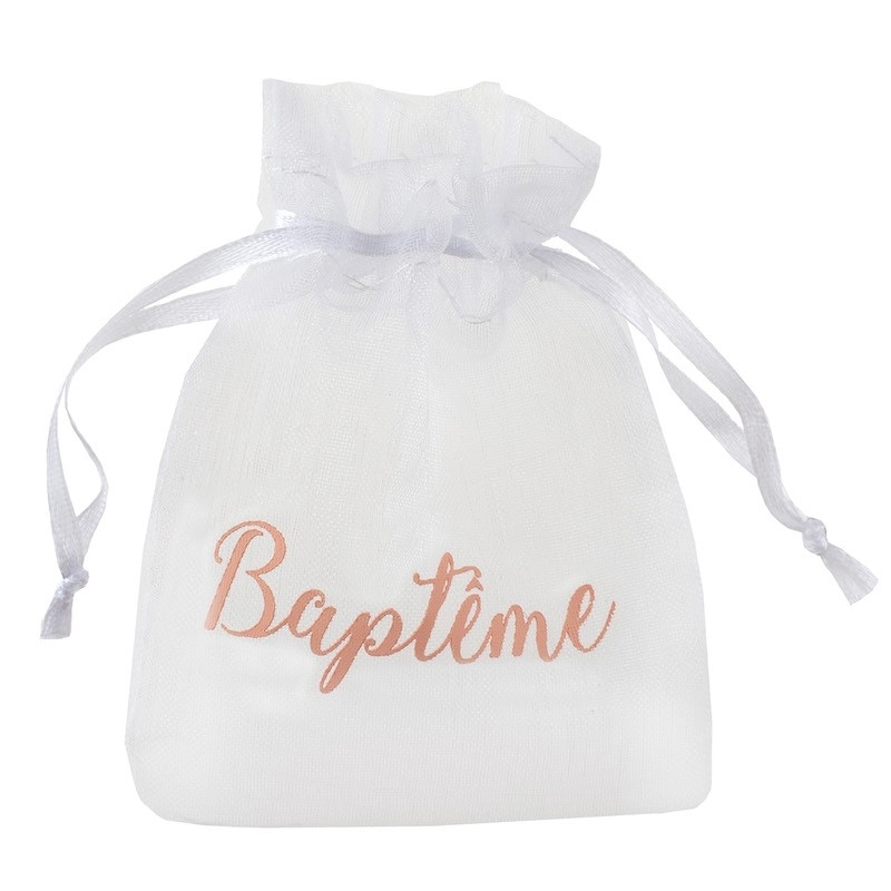 Bereiten Sie Ihren Gästen eine kleine Freude und bedanken Sie sich bei Ihren Lieben mit Süssigkeiten oder Hochzeitsmandeln. Die weissen, Organza-Säckchen sind auf der Vorderseite mit dem Schriftzug "Baptême" aus kunstvoll geschwungenen Buchstaben versehen.
