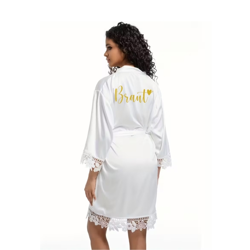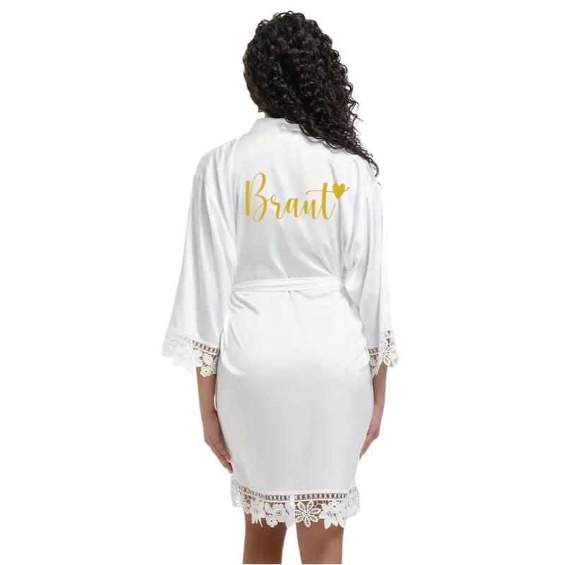 Der goldene Schriftzug „Braut“ wird hochwertig auf den Morgenmantel aufgebracht und verleiht ihm eine edle, persönliche Note. Dank des passenden Gürtels lässt sich der Morgenmantel individuell an der Taille binden und sorgt so für eine perfekte Passform.