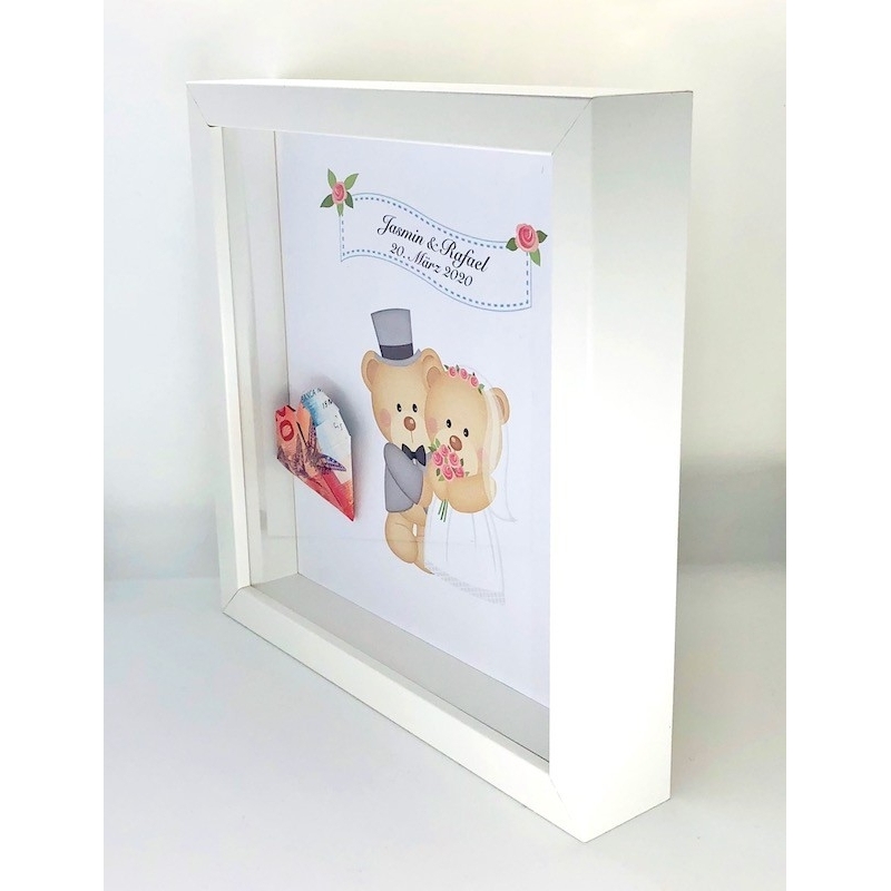 Einen langweiligen Umschlag mit ein paar Geldscheinen zu verschenken, ist nicht besonders kreativ. Mit dieser individuell und personalisierter Geldverpackung freut sich das Hochzeitspaar sicher nicht nur über das Geld. Er kann aufgehängt oder aufgestellt werden.