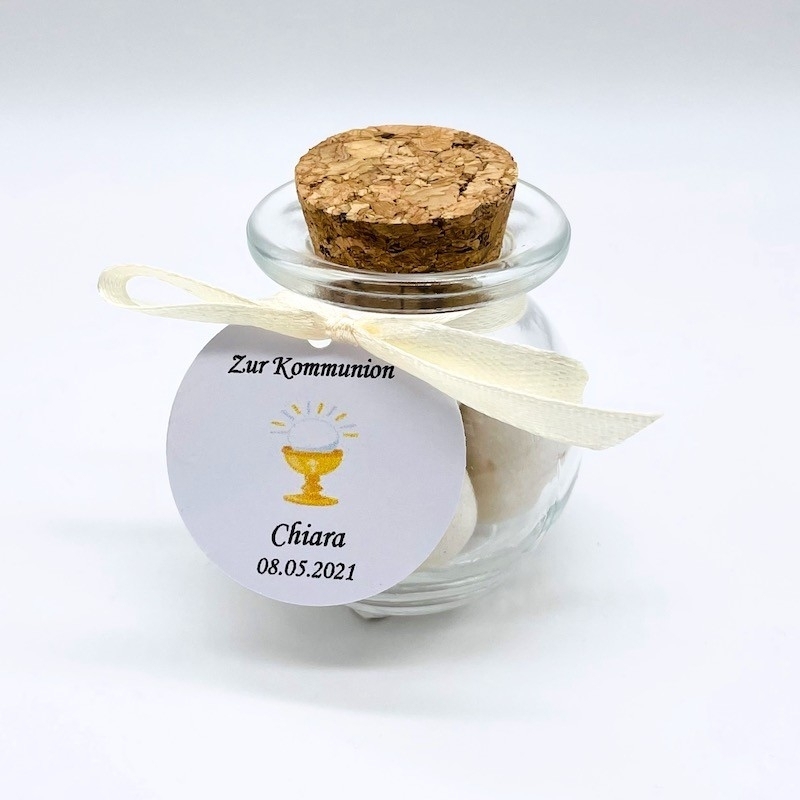 Die Glasfläschchen werden mit 5 Mandeln, Schleife und personalisierter Anhänger geliefert. Bitte Name, Datum und Bändchenfarbe angeben.