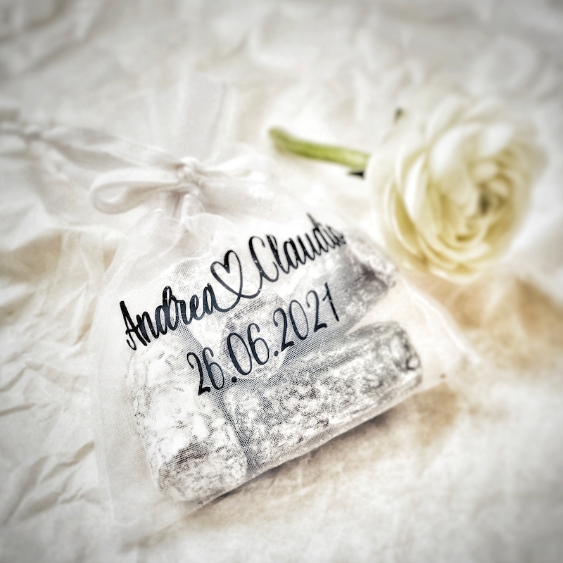 Sicherlich eine grosse Freude für Euch und alle Eure Gäste sind diese personalisierte Organzasäckchen mit Satinband.