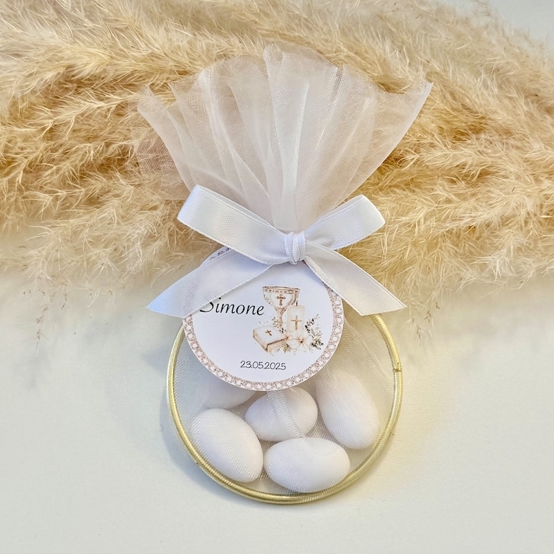 Dieses Geschenk besteht aus fünf fein umhüllten Mandeln, liebevoll verpackt in einem zarten Tüllsäckchen und verziert mit einer Schleife. Der goldene Ring verleiht dem Präsent eine edle Note – perfekt für Kommunion, Konfirmation, Firmung oder besondere Anlässe