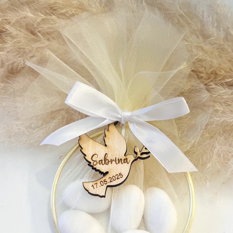Dieses Geschenk besteht aus fünf fein umhüllten Mandeln, liebevoll verpackt in einem zarten Tüllsäckchen und verziert mit einer Schleife. Der goldene Ring verleiht dem Präsent eine edle Note – perfekt für Kommunion, Konfirmation, Firmung oder besondere Anlässe.