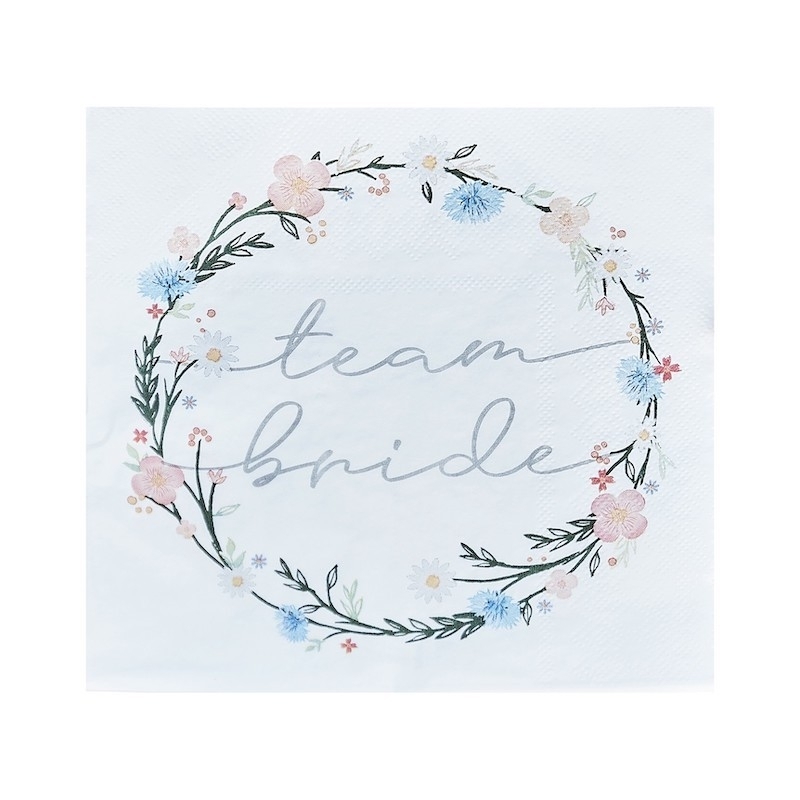 Diese wunderschönen Papierservietten sind mit dem Text "team bride" beschriftet und mit einem Blumenkranz im Boho-Stil verziert.
