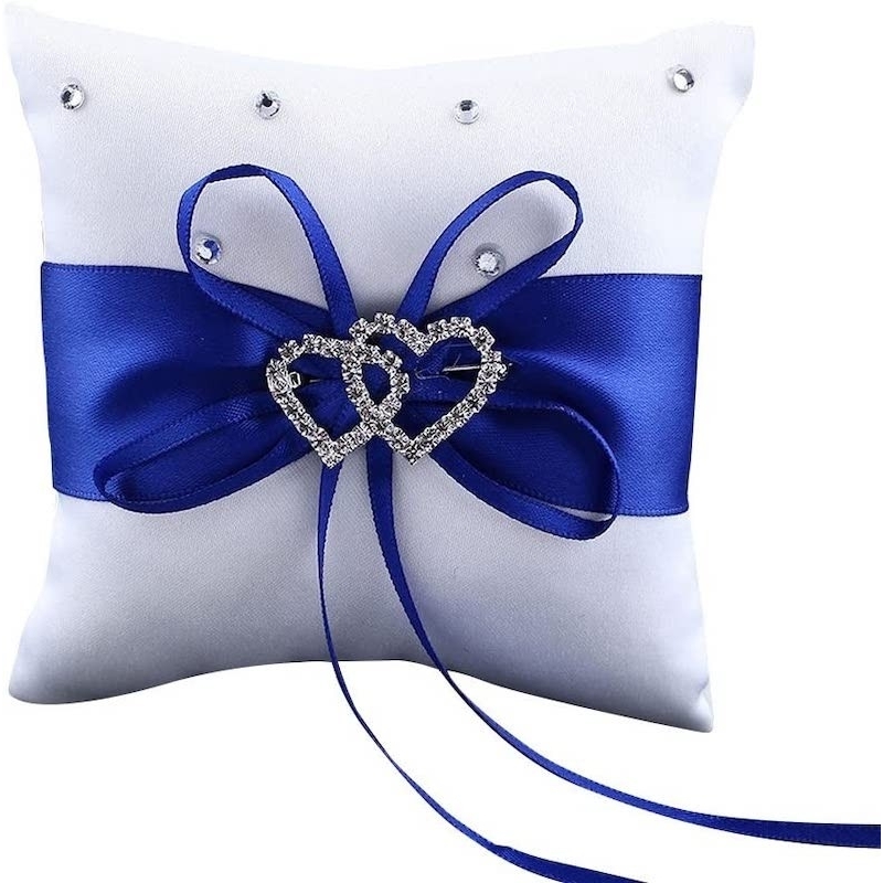 Sehr schönes Ringkissen mit Diamanten verziert, breite blaue Schleife und zwei unterschiedlich grossen Strassherzen mit zwei langen schmalen Satinbändern für die Eheringe.