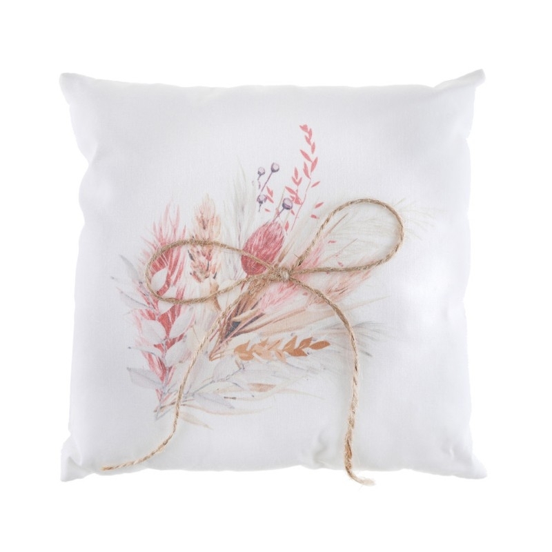 Wunderschönes Ringkissen aus Baumwolle. Ein perfekter Ringhalter für eine Hochzeit dem trendigen Pampasgras Motiv. In der Mitte des Ringkissens ist auf der Vorderseite eine schöne Schleife aus Juteband befestigt.