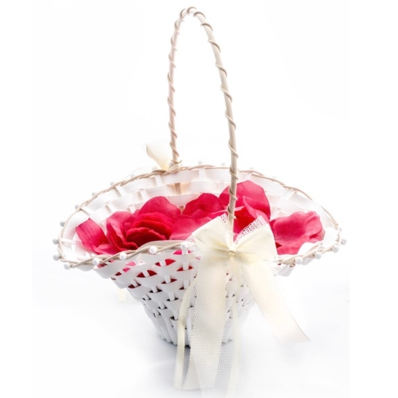 Biedermeierkorb aus geflochtenem weissem Kunststoff mit Rand und Bügel aus gebleichtem Rattan. Ideal als Streukörbchen für Streublumen zur Hochzeitsfeier.