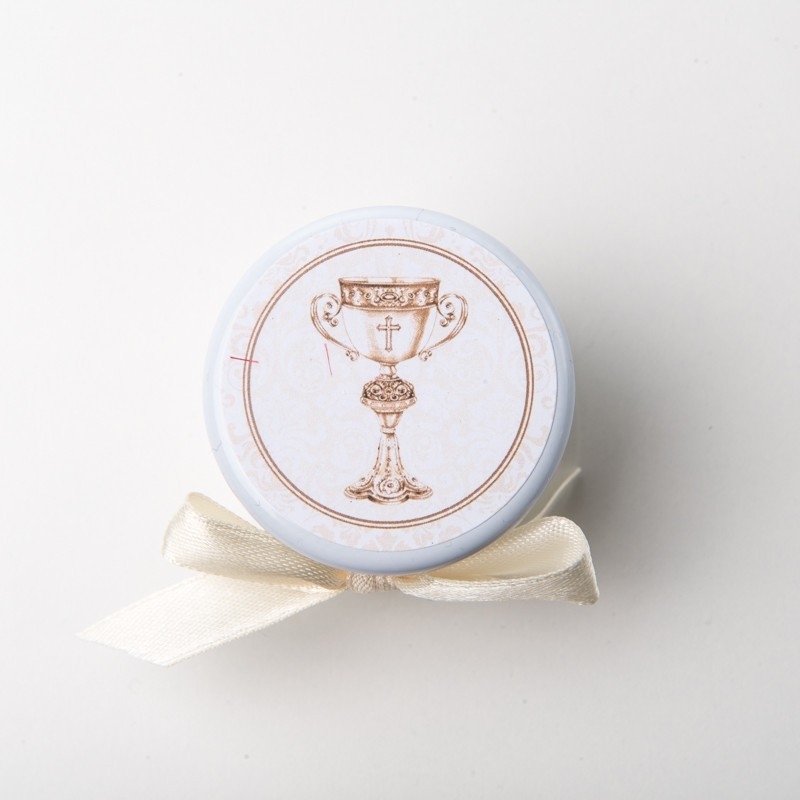 Perfekt als elegantes Gastgeschenk zur Kommunion: Schraubgläschen mit Deckel und Satinschleife. Auf dem Deckel ist ein Aufkleber mit einem Kelch Symbol angebracht. Das Gastgeschenk wird mit 5 weisse Hochzeitsmandeln geliefert.