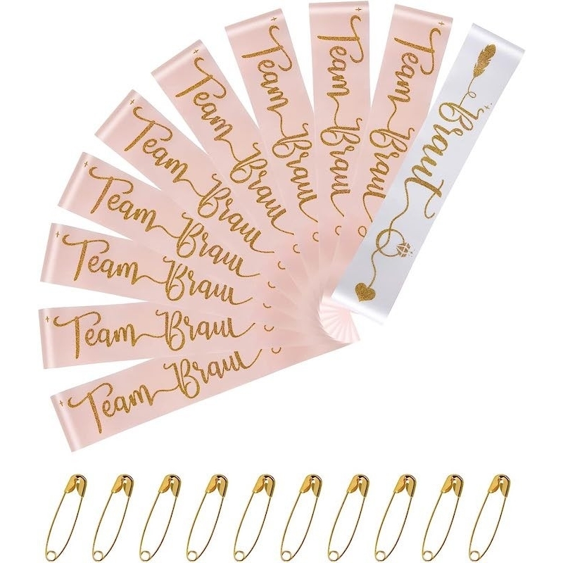 Dieses Schärpen Set besteht aus 1 x Braut Schärpe und 9 x Team Braut Schärpe. Mit diesen Schärpen werden die zukünftige Braut und die Teilnehmerinnen zum absoluten Hingucker und der Junggesellinnenabschied bzw. die Hen Party ein voller Erfolg...