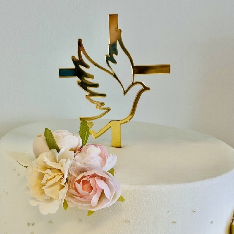 Dieser elegante Torten-Topper mit Kreuz und Taubenmotiv ist ein besonderes Highlight für jede Torte. Das filigrane Design aus hochwertigem goldfarbenem Acryl symbolisiert Glaube, Frieden und den Heiligen Geist und passt perfekt zu einem feierlichen, christlichen Anlass.