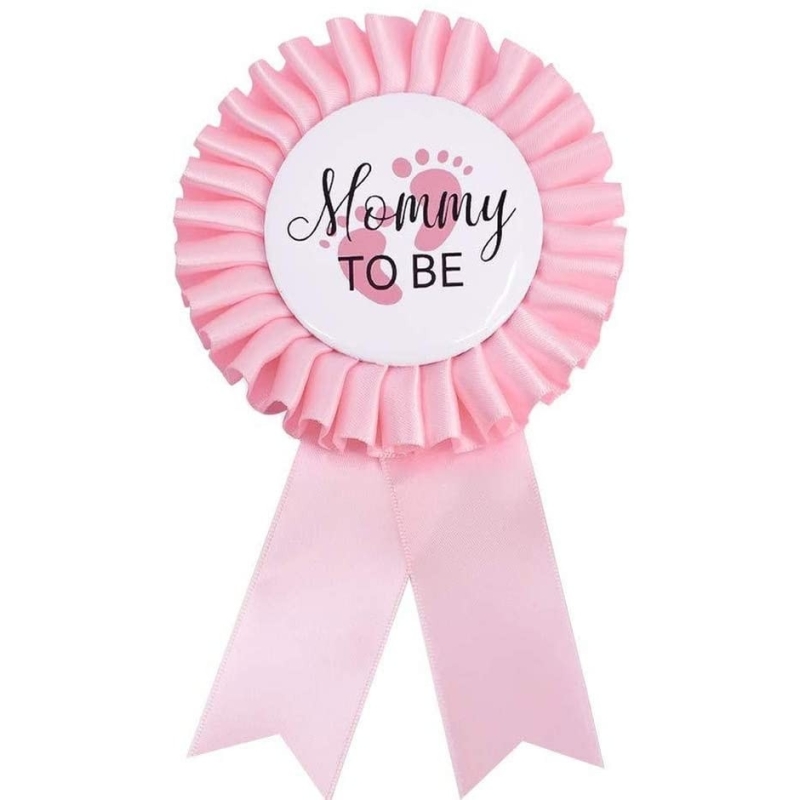 Au milieu de l'insigne, on trouve l'inscription "Mommy to be" est décorée de jolis petits pieds de bébé.Le badge a un diamètre de 10 cm, le ruban en satin est long 18 cm.