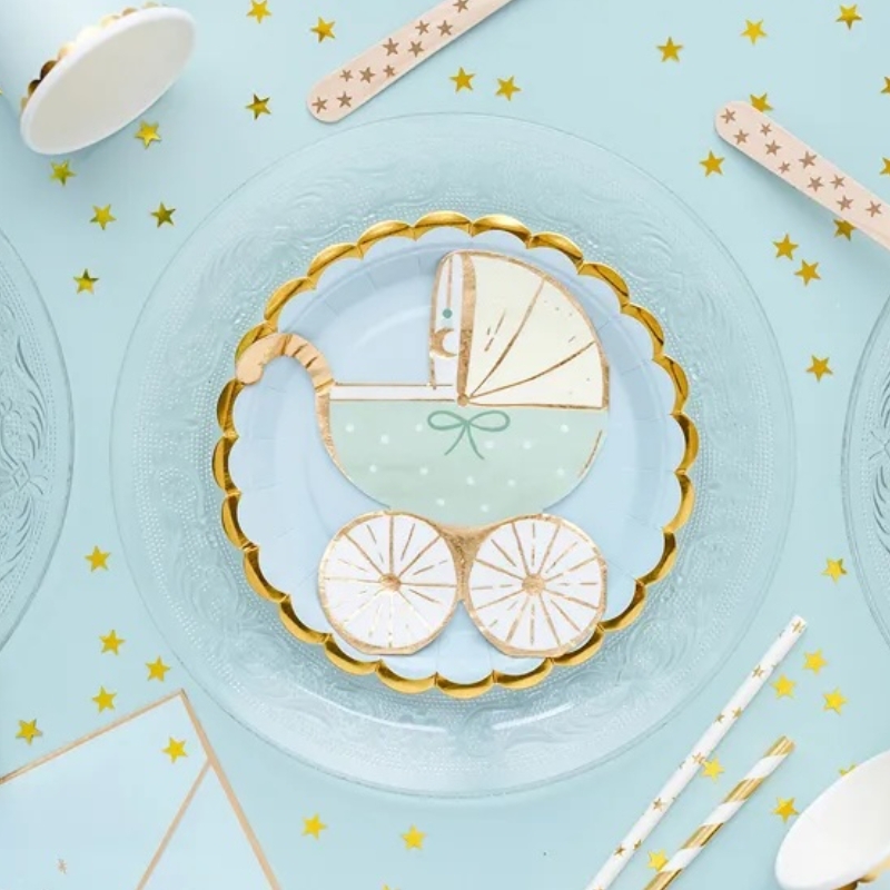 Ces serviettes élégantes, ornées d'un motif de landau dans des tons bleu et doré, sont le complément idéal pour toute fête prénatale, baptême ou fête d'anniversaire. Leur design raffiné, aux couleurs délicates et aux détails brillants, crée une ambiance festive et chaleureuse sur votre table dressée.